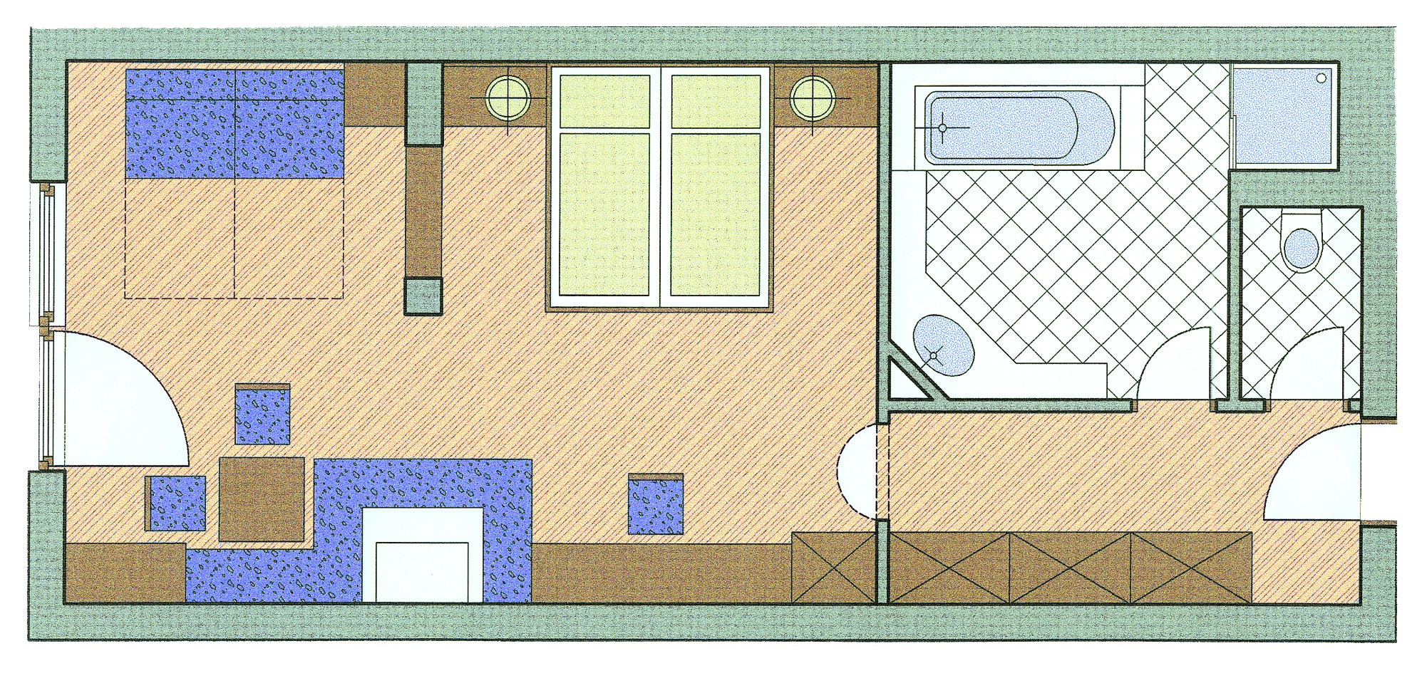 Das Zimmer ist ausgestattet mit Boxspringbett (200x210), seperatem WC, Sat-TV mit HD, Radio, Safe, Fön, Bademantel und -schlappen, Telefon